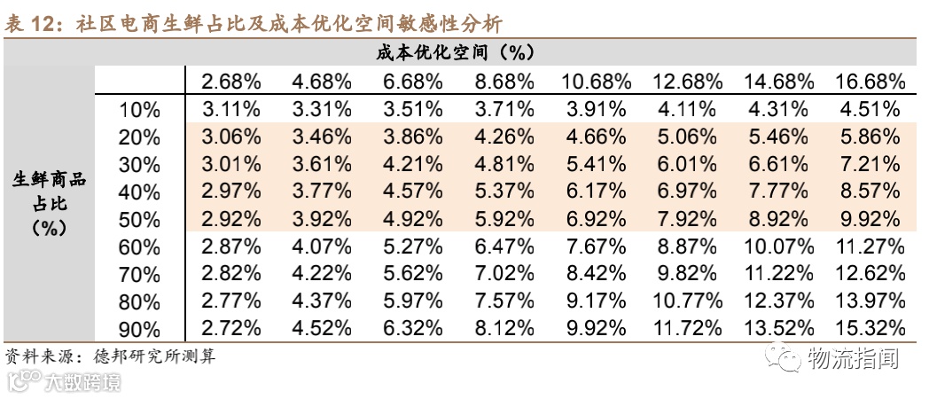 流通成本下行空间对应社区电商平台毛利率提升空间与价格补贴空间,考虑当前社区团购平台生鲜占比20%~50%,成本优化空间实际值应低于17.35%(由于流通环节部分外包情况下仍有盈利要求等)。