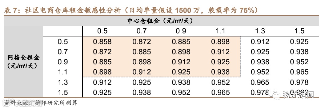 (2)租金:根据物联云仓,2019年全国主要城市仓库平均租金从19.95元/平米/月至43.76元/平米/月不等,我们假设中心仓平均租金为1.5元/平米/天,网格仓平均租金为1元/平米/天。