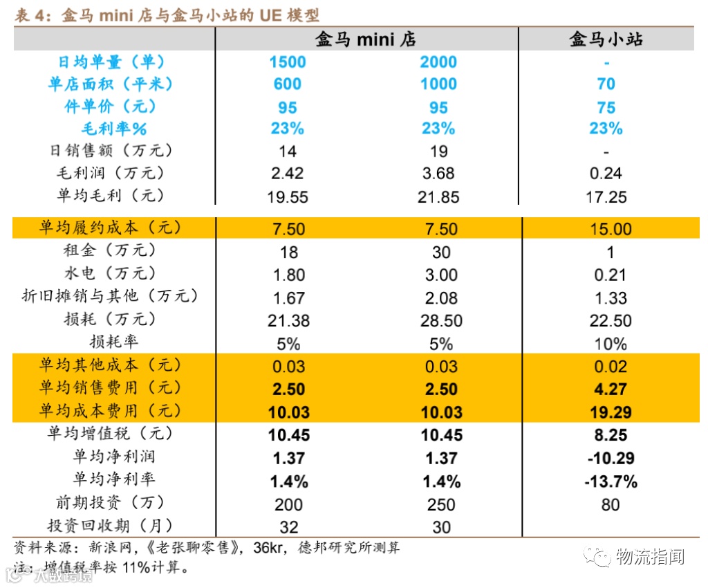 ②租金:盒马mini店以日平均租金水平10元/平米计算,盒马小站以日平均租金水平33元/平米计算;③水电:假设水电300元/天。④盒马mini店铺(600平米、1000平米)及盒马小站总投资分别为200、250万元和70万元,门店按10年直线折旧,仓库按5年折旧。