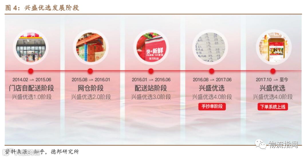 历经三年摸索社区电商模式。2013年7月公司孵化电商平台“兴盛优选”,先后经历门店自配送阶段、网仓阶段、配送站阶段。2017年“预售+自提”模式逐渐成型。