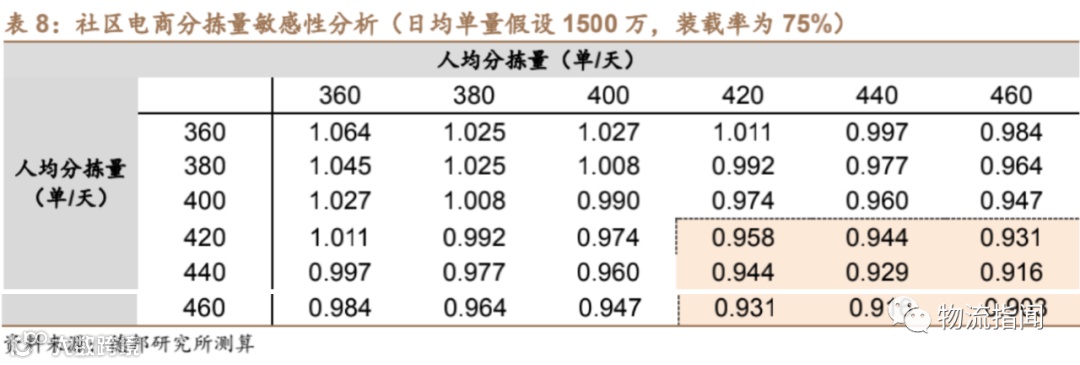 (2)通过提升分拣效率优化可变成本:在其他条件不变的情况下,假设日均订单1500万,运输装载率75%,通过提升人均分拣订单量(通过延长人均有效工时或引入分拣机器,优化工作流程等措施),我们估算单均履约成本能够从0.958元/单降低至0.903元/单,理论降幅达5.74%。