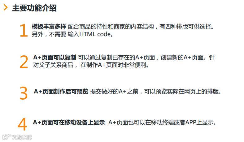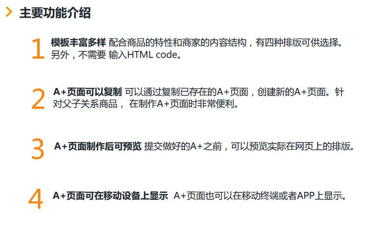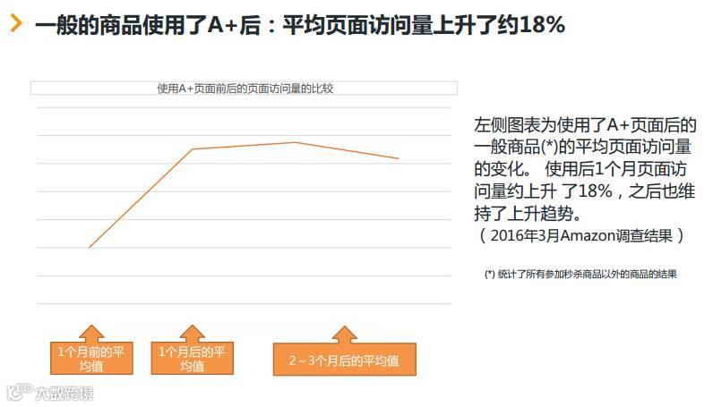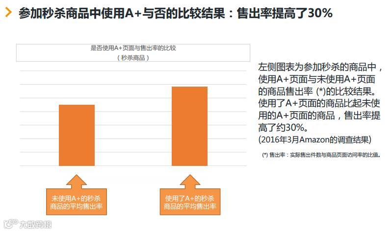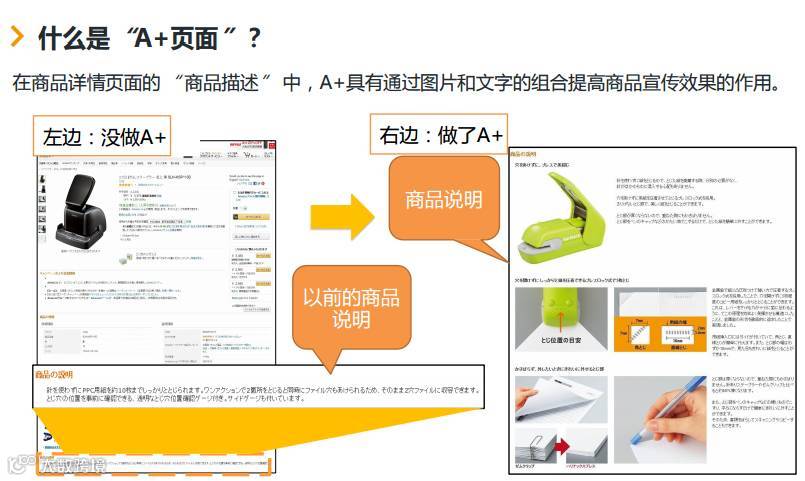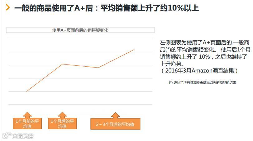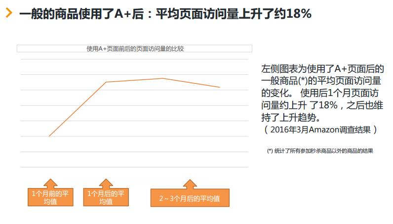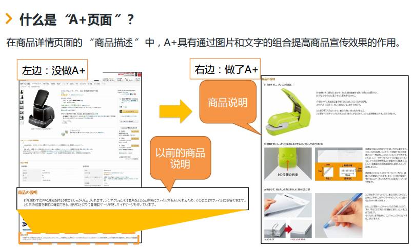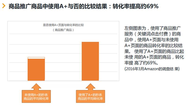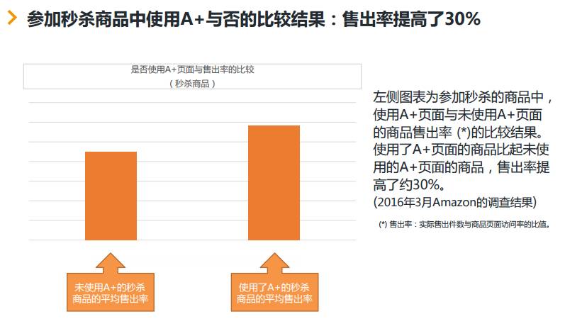 “A+页面” 对销售额的促进 Amazon卖家大学 我们发现,引入A+页面的商品的销售额有所提高(具体请参考下一页以后的内容)。通过组合图片与商品说明,更好地体现了商品特征、差异点、商品魅力等具体的 诉求点,从而可以起到促进消费者的购买决定的效果。并且通过插入适当的关键词与说 明文,还可以更好地起到搜索引擎优化(SEO)的效果。我们建议您从销售较高的商品、 卖家的独有商品、以及有浏览量但销售额尚较低的商品开始,尝试使用A+页面服务。