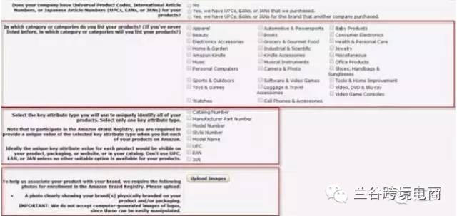 下图就是最后一步,选择你产品的类别,一次只能选一个,选多个会出错,登记品牌的时候要选择key attributes,产品的唯一标示。关于免去UPC,如果卖家的产品申请保护之后,可以用产品名字和key attributes通过创造文件的方式上传,注意无法在后台直接添加,要用text文档上传。一个商标只能对应一个key attributes。