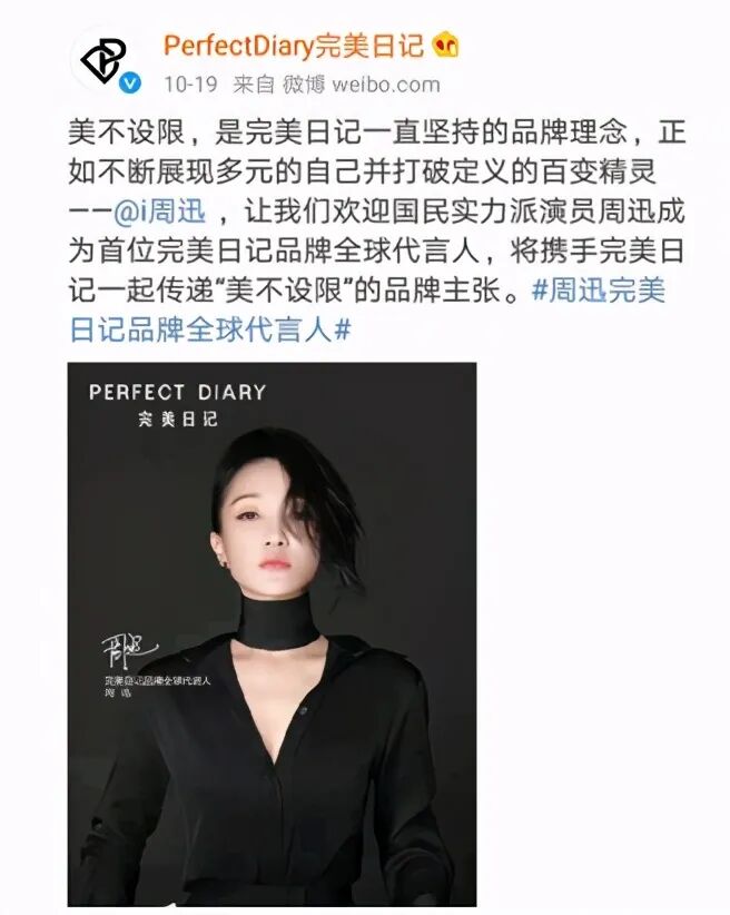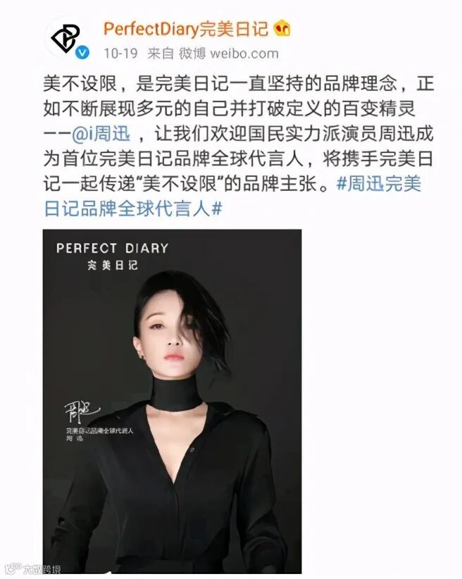 在营销方式上,联名推广及请多位明星代言。本着“万物皆可联名”的原则,完美日记上线动物眼影盘、地理眼影盘等联名产品,还与奥利奥、艺术博物馆共同打造联名美妆等。同时,今年10月,完美日记宣布由周迅担任其首位全球代言人。而此前,采用的也都是年轻的流量明星,例如唇妆代言人朱正廷、底妆代言人赖冠霖、色彩代言人罗云熙,还有沈月、文淇、吴青峰等多位支线产品宣传大使。