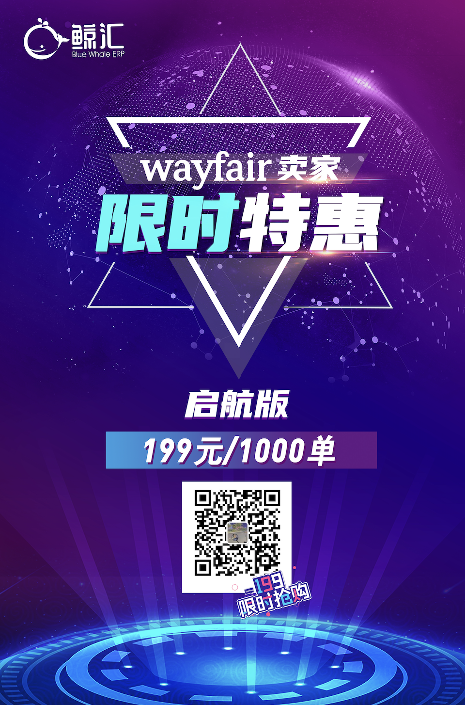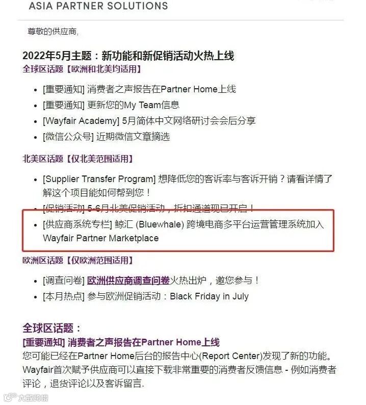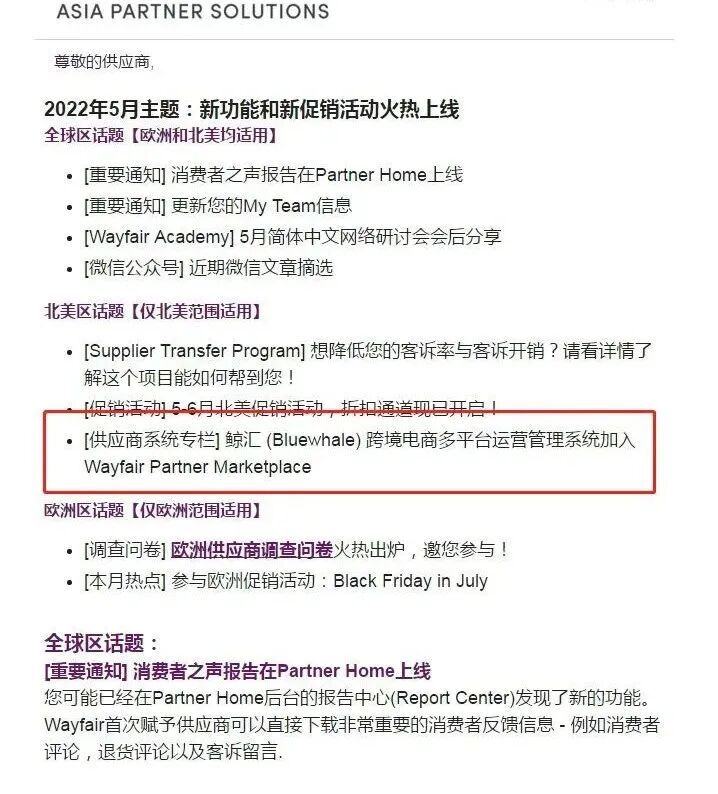“ 2022年5月24日,鲸汇ERP与wayfair平台实现全链路融合,成为亚洲地区唯一实现全链路融合的认证服务商,限时回馈Wayfair卖家,推出199元促销启航版。”