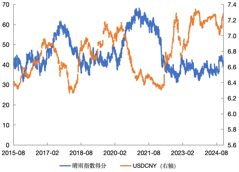 过去10年中信银行晴雨指数得分与人民币即期汇率的关系