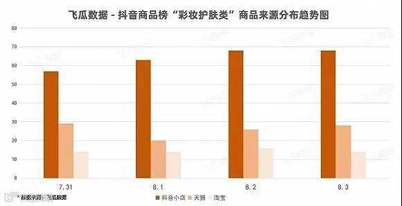 据飞瓜数据显示,公告发布后的几日中,抖音商品榜“彩妆护肤类”商品约65%来源于抖音小店,有明显的增长,而天猫、淘宝渠道平均占比分别为25%、15%左右。