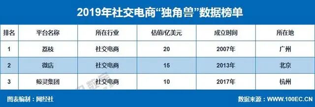 2019年社交电商“独角兽”共三家,分别是荔枝、微店及鲸灵集团,估值分别为20亿美元、15亿美元、10亿美元及14.62亿美元,总估值达45亿美元。