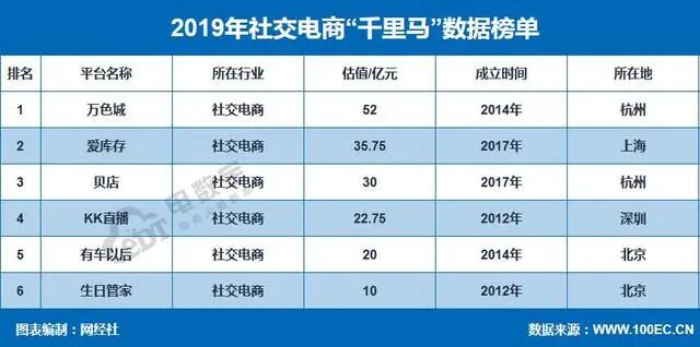 2019年社交电商“千里马”共六家,分别是万色城、爱库存、贝店、KK直播、有车以后、生日管家,估值分别为52亿元、35.75亿元、30亿元、22.75亿元、20亿元、10亿元,总估值达170.5亿元。