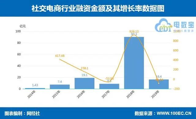 报告显示,2019年我国社交电商融资总额达16.4亿元,较2018年的90.3亿元,同比下降-81.84%。