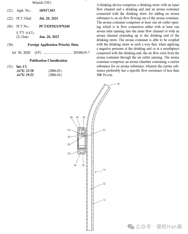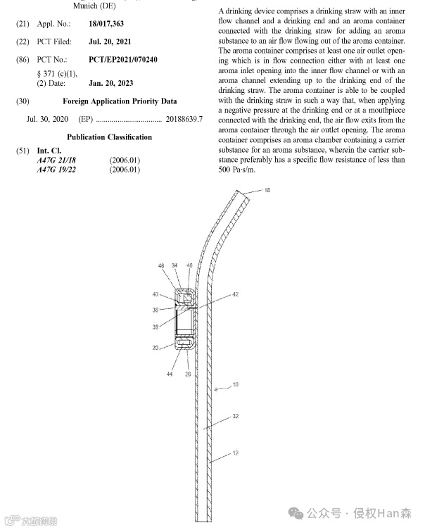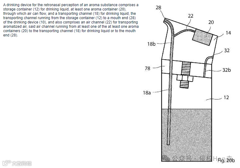 US2023270270 (A1)一种饮用装置,包括具有内部流动通道和饮用端的饮用吸管和与饮用吸管连接的用于将芳香物质添加到从芳香容器流出的气流中的芳香容器。香气容器包括至少一个空气出口,该空气出口与进入内部流动通道的至少一个香气入口或者与延伸到饮用吸管的饮用端的香气通道流动连接。香气容器能够以这样的方式与饮用吸管连接,即,当在饮用端或与饮用端连接的吹口处施加负压时,气流通过空气出口从香气容器排出。香气容器包括含有用于香气物质的载体物质的香气室,其中载体物质优选具有小于500Pa·s/m的比流动阻力。