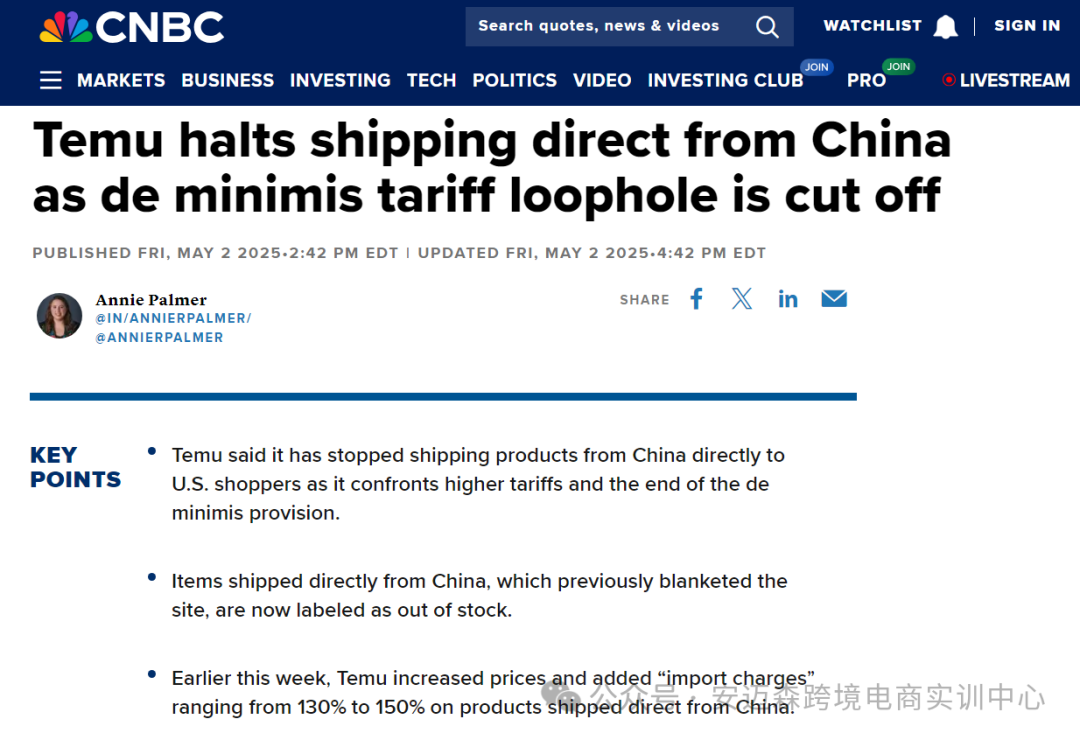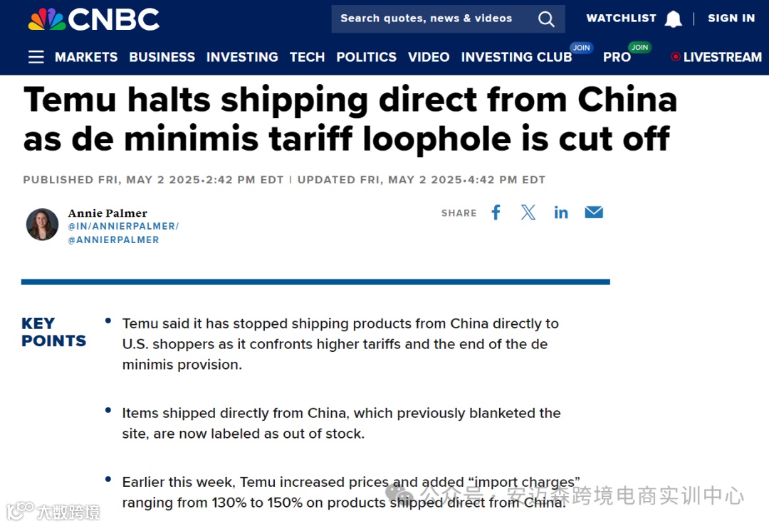近日,据外媒报道,Temu突然宣布暂停所有从中国直发美国的业务,美国站商品将全部改由本土卖家履约。这一动作直接指向美国T86小额豁免政策的正式取消。