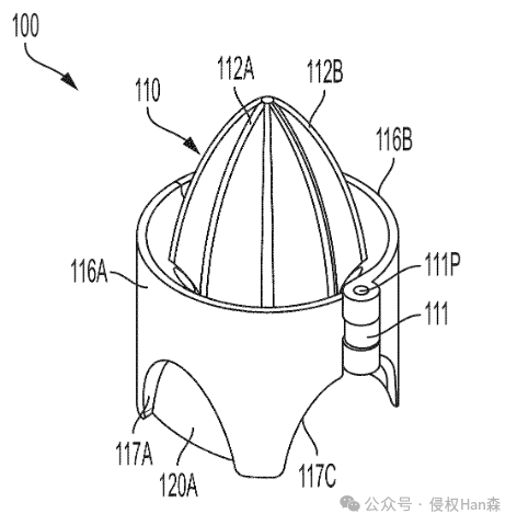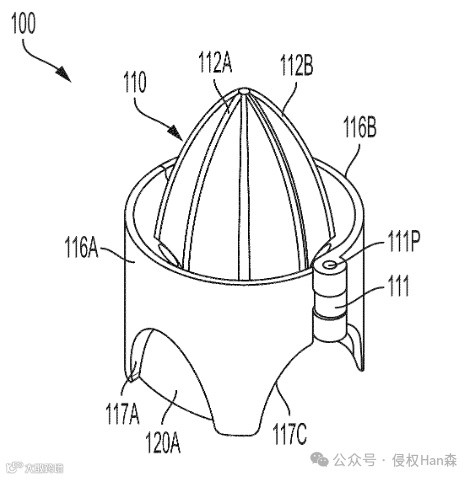 US11839322B1为了提高传统削皮器的安全性和效率,本发明人设计了一种儿童友好的双向扭转作用削皮器。一种示例性的削丝器包括外壳和至少两个光栅元件。壳体限定内部容积,该内部容积构造成容纳整个柑橘类水果的至少一部分,并且第一和第二磨碎元件安装至壳体,使得它们的磨齿面向内部并接触整个柑橘类水果,从而防止血腥。擦皮时手指和指关节。此外,每个磨碎元件包括与其他磨碎元件中的一些齿相对的至少一些齿,使得削皮器能够随着削皮器相对于水果的每次前后运动而产生果皮。一些其他实施例将扩孔器添加到外壳,使得削皮器能够用作削皮器和榨汁机。