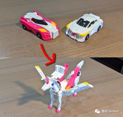 变形玩具附带 2 辆汽车,当你将粉红色的汽车推到白色汽车的后部时,它们会立即变成独角兽,独角兽前部一辆车,独角兽后部另一辆车。从汽车到独角兽的转变发生得如此迅速和令人敬畏