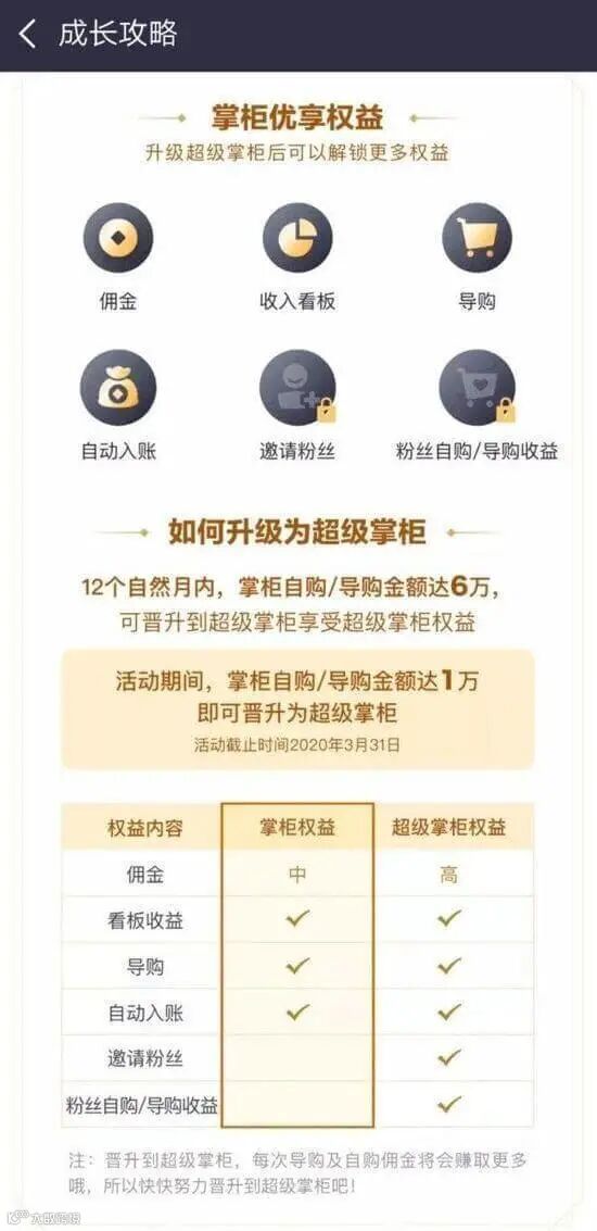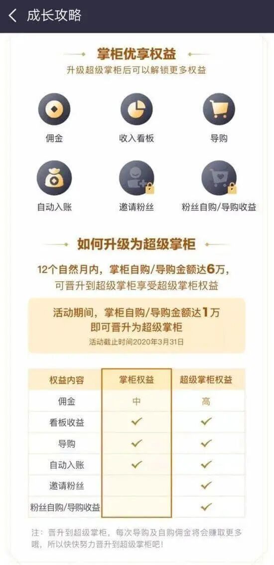掌柜分两个等级,即掌柜和超级掌柜,其规则是在规定期限内累积一定金额,即可成为超级掌柜,这一点与阿里淘宝旗下的首款社交电商平台,“淘小铺”的晋升规 则类似。作为超级掌柜,就能拥有邀请码特权,通过邀请一大批新的掌柜,可以从这些新掌柜的订单金额中抽取部分佣金。普通的掌柜只能分享商品链接给他人,他 人买了商品并成交后才能获取佣金。