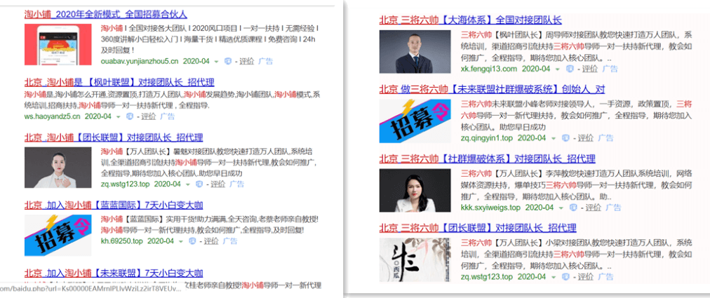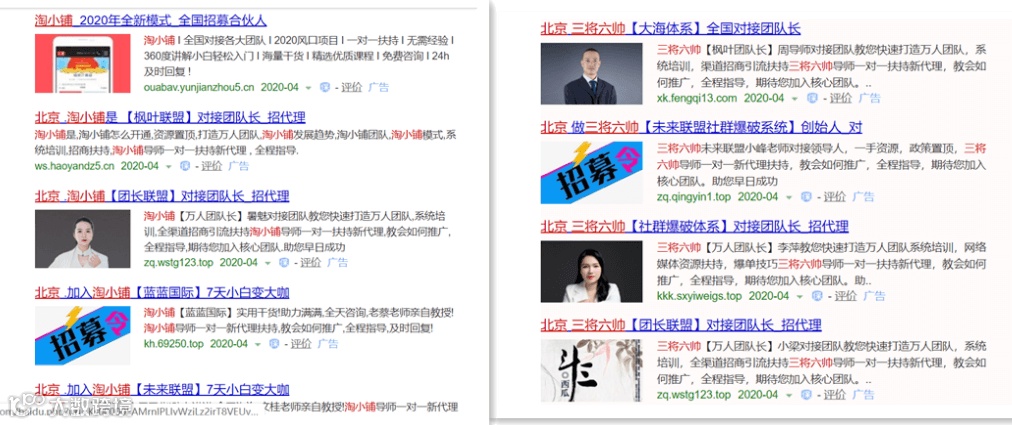 这也就是目前淘小铺出现许多在百度推广上主动打广告的原因,例如:未来联盟、枫叶联盟、团长联盟等,点开一看均是关于淘小铺的广告,还不忘记狠狠贴上阿里强大的背书。此外,三帅六将不少销售团队也争先恐后主动打起广告,随便点开都是淘小铺推荐广告。