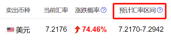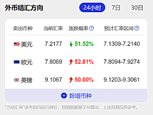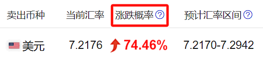涨跌概率”是AI汇涨赋予用户的汇率走势密钥,量化展示未来一段时间(24小时、7日、30日)某外币兑人民币汇率上涨或下跌的可能性。例如,当您关注美元兑人民币汇率时,AI汇涨可能会显示: