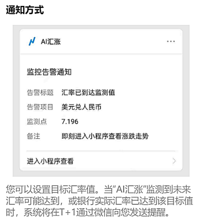 AI汇涨当前主要专注于美元、欧元、英镑等主流外币兑人民币汇率的预测与监测,致力于帮助用户规避结汇风险。但这仅是AI汇涨管理之旅的起点,未来,我们将应用户需求,拓展更多币种支持,并纳入更多服务,为我们的用户构建全维度外汇风险管理平台。所以,即刻点击小程序加入我们吧↓