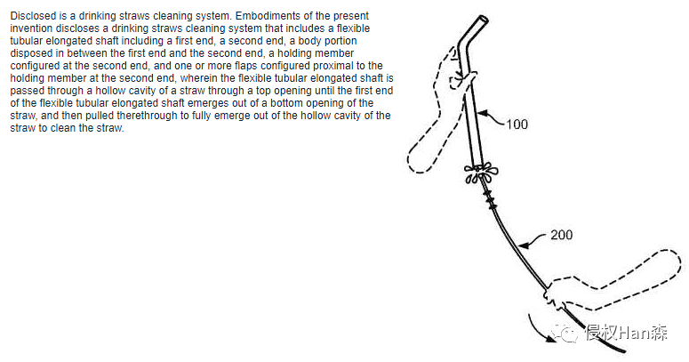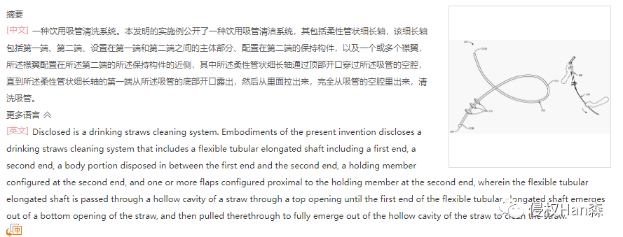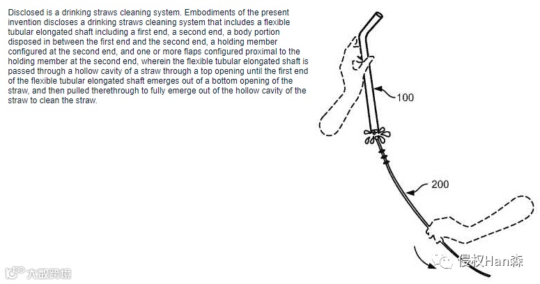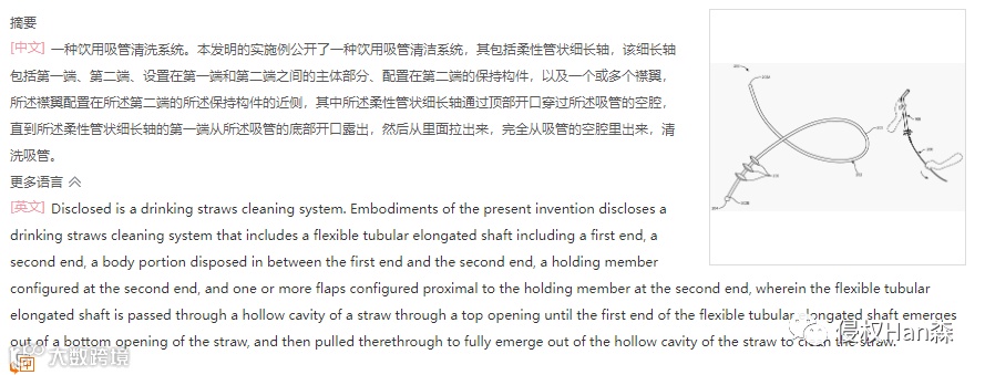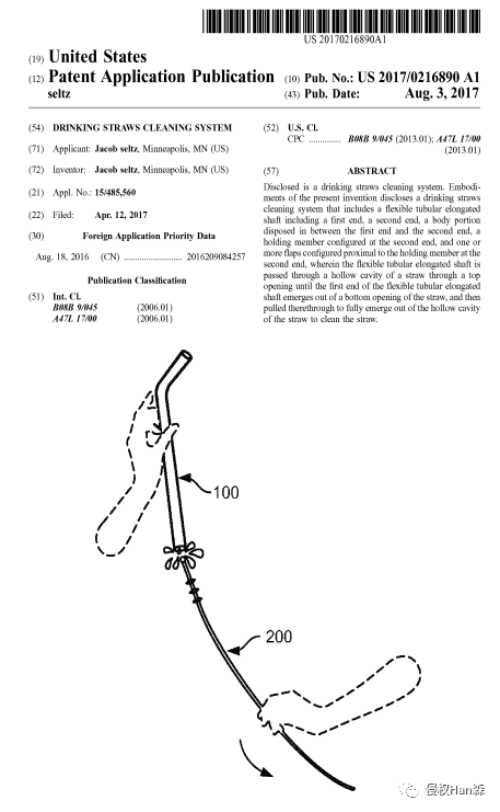 US10499791 (B2)一种吸管清洗系统。本发明的实施例公开了一种吸管清洁系统,该吸管清洁系统包括柔性管状细长轴,该细长轴包括第一端、第二端、设置在第一端和第二端之间的主体部分、配置在第二端的保持构件、以及配置在第一端的保持构件附近的一个或多个翼片,其中,所述柔性管状细长轴通过顶部开口穿过吸管的空腔,直到所述柔性管形细长轴的第一端从所述吸管的底部开口露出,然后拉动所述柔性筒形细长轴以完全从所述稻草的空腔露出,以清洁所述吸管。Disclosed is a drinking straws cleaning system. Embodiments of the present invention discloses a drinking straws cleaning system that includes a flexible tubular elongated shaft including a first end, a second end, a body portion disposed in between the first end and the second end, a holding member configured at the second end, and one or more flaps configured proximal to the holding member at the second end, wherein the flexible tubular elongated shaft is passed through a hollow cavity of a straw through a top opening until the first end of the flexible tubular elongated shaft emerges out of a bottom opening of the straw, and then pulled therethrough to fully emerge out of the hollow cavity of the straw to clean the straw.