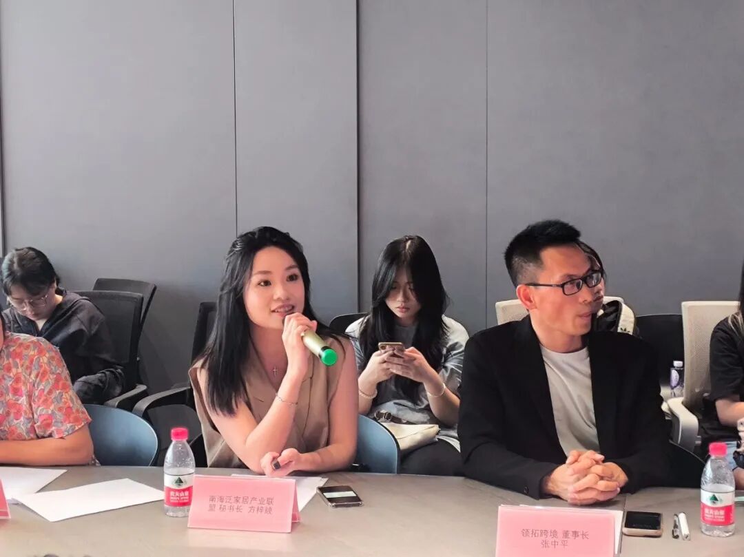 基地方出席的代表有泛家居企业联合会秘书长方梓绫、领托跨境董事长张中平、广东省跨境电子商务协会秘书长吴航、时代集团代表谢素萍,以及领拓的各位领导与工作人员。过来参加座谈会的分别是广东省外语艺术职业学院外语外贸学院党委书记潘小波、广东省外语艺术职业学院副校长张斌、广东省外语艺术职业学院外语外贸学院副院长张少辉等领导,以及广东省外语艺术职业学院的数十名学生。