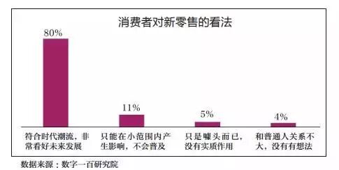 好消息是,从数字100研究院的调研数据来看,普通消费者对于新零售的未来很有信心,80%的消费者认为“新零售符合时代潮流,非常看好未来发展”。可见新零售市场对于消费者的初步普及教育已经基本完成。