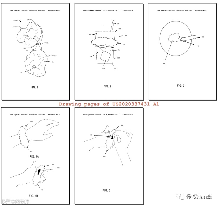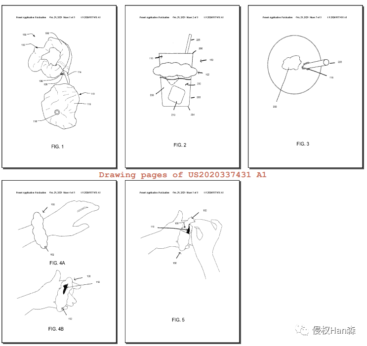 US11197525 (B2)一种饮料防刺装置,包括发饰和盖子。该发饰具有形成圆形的带,并且该带是弹性的。所述发饰还具有形成封装所述弹性带的管的发饰织物和联接到所述发廊织物的袋。盖子存放在袋子中,可从袋子中取出。覆盖物包括延伸到周边的覆盖物织物、形成在覆盖物中的孔、以及从周边延伸并连接到发饰的绳索。盖子通过周边覆盖杯子的开口并与开口的直径一致,以防止新材料被添加到杯子中的液体中。