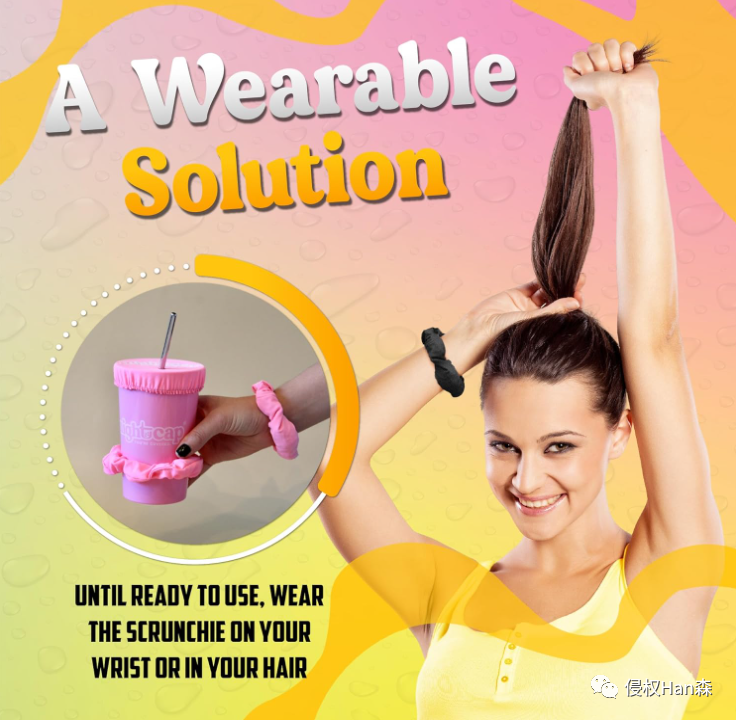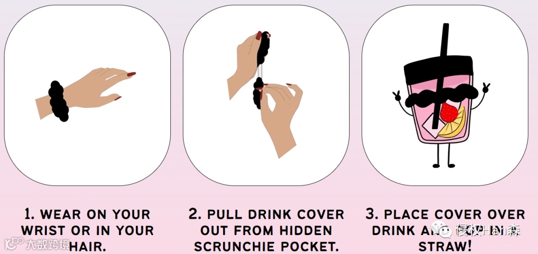 1.戴在手腕上或头发上2.将饮料盖从隐藏的颈圈口袋中拉出。·3.将盖子盖在饮料上,然后放入吸管!