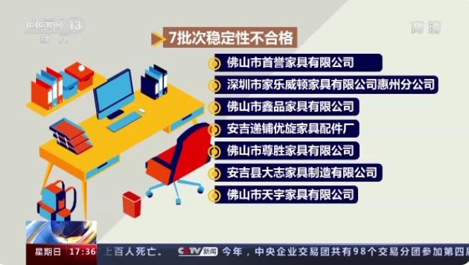 值得注意的是,7批次稳定性不合格的产品中,有4批次来自佛山。分别是佛山市首誉家具有限公司的办公椅、佛山市鑫品家具有限公司、佛山市尊胜家具有限公司和佛山市天宇家具有限公司。
