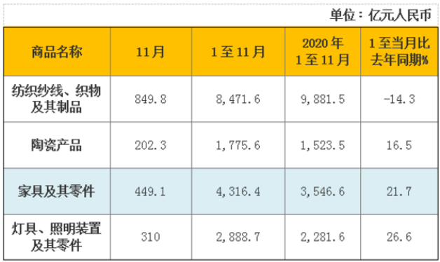 12月7日,国家海关总署公布了今年11月份累计进出口数据(人民币值)。数据显示,1-11月,我国进出口总值35.39万亿元,同比增长22%。11月份,我国进出口总值3.72万亿元,同比增长20.5%。其中,出口2.09万亿元,同比增长16.6%;进口1.63万亿元,同比增长26%。家居行业方面数据,1-11月份,家具及其零件出口额为4316.4亿元,同比增长21.7%;其中11月出口额为449.1亿元,环比增长7.4%。灯具照明方面,1-11个月,灯具、照明装置及其零件出口额为2888.7亿元,同比增长26.6%;11月出口额为310亿元。陶瓷方面,1-11月,陶瓷产品出口额为1775.6亿元,同比增长16.5%;11月出口额为202.3亿元。