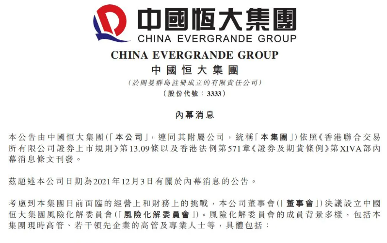 12月6日,中国恒大在港交所公告,考虑到集团目前面临的经营上和财务上的挑战,公司董事会决议设立中国恒大集团风险化解委员会,许家印出任风险化解委员会主席。值得注意的是,风险化解委员会其他成员背景多样。7位成员中,2位是恒大高管,其余5位均来自外围,集合了相应的政府和专业机构的力量。其中,粤海控股集团属于广东省政府全资国资企业、越秀集团则是广州市政府绝对控股的企业,中国信达则是专门从事不良资产处置的四大AMC之一,国信证券和中伦律师事务所则是专业的资本运作和法律中介机构。