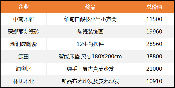 10月14日-17日展会期间,现场将进行“寻找锦鲤”抽奖活动,预计抽取多个锦鲤大奖,奖品包括:现金红包、高级地砖、实木地板、精美岩板挂画、爆款沙发、智能床垫等,奖品总值数万元!