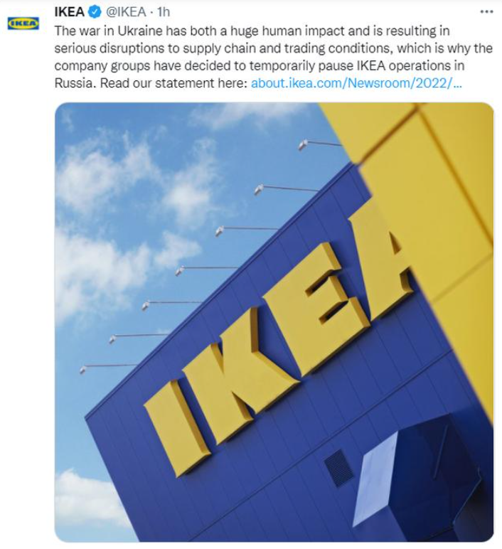 3月3日,瑞典家居品牌宜家(IKEA)发文称,俄乌冲突导致供应链中断、贸易受阻,因此决定暂时关闭其在俄罗斯的所有门店,并暂停在俄罗斯和白俄罗斯的所有采购计划。宜家表示,此举将影响到15000名员工,但公司至少会在接下来的三个月为他们提供薪水,并为其家人提供支持。消息一出,民众们纷纷挤进了位于莫斯科、圣彼得堡、鄂木斯克以及新西伯利亚等地的宜家店,来了一次疯狂的购物。另据路透社报道,宜家在白俄罗斯并无门店,但宜家在俄罗斯共有17家门店。截至21年8月,俄罗斯是宜家的第十大市场,占其总零售额的4%。