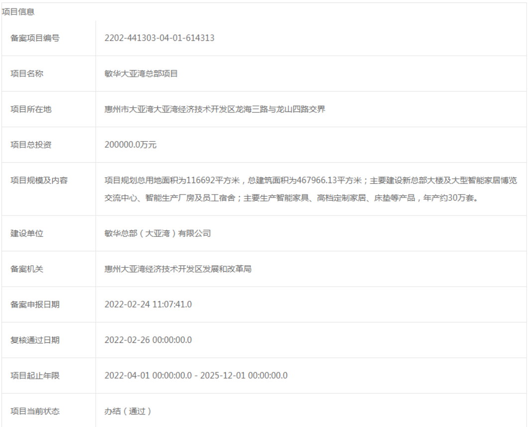 据广东政务服务网官网公示,敏华大亚湾总部项目已通过惠州大亚湾经济技术开发区发展和改革局审核备案。备案信息显示,敏华大亚湾总部项目规划总投资约20亿元,由敏华总部(大亚湾)有限公司负责建设。该项目总用地面积为116692㎡,总建筑面积为467966.13㎡,规划建设新总部大楼及大型智能家居博览交流中心、智能生产厂房及员工宿舍;主要生产智能家具、高档定制家居、床垫等产品,年产约30万套。建设起止年限为2022年04月01日-2025年12月01日,建设周期预计46个月。也就是说,敏华大亚湾总部项目最快将在下个月动工,但具体动工时间仍需看项目实际进度。