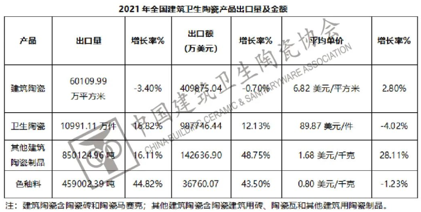 2021年建筑卫生陶瓷出口达157.7亿美元