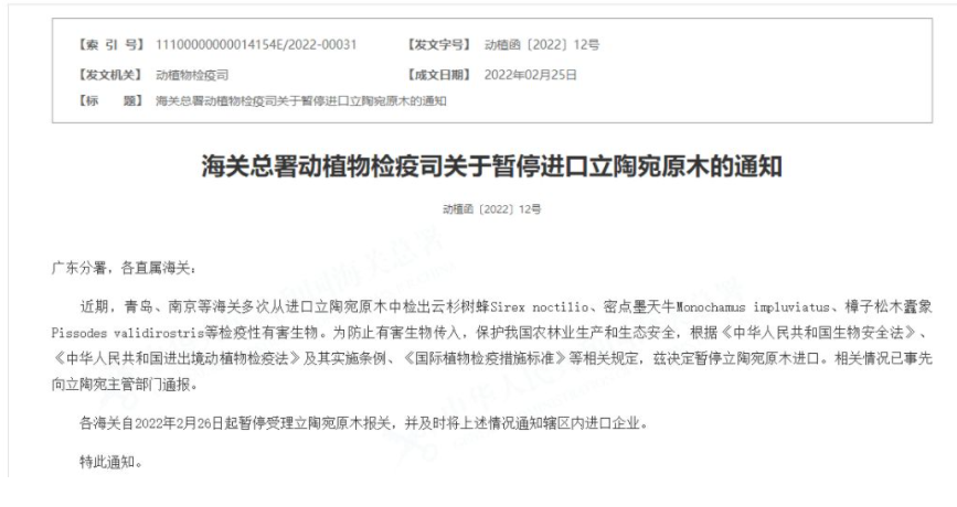 近日,海关总署发布《动植物检疫司关于暂停进口立陶宛原木的通知》。通知称,近期,青岛、南京等海关多次从进口立陶宛原木中检出云杉树蜂Sirex noctilio、密点墨天牛Monochamus impluviatus、樟子松木蠹象Pissodes validirostris等检疫性有害生物。为防止有害生物传入,保护中国农林业生产和生态安全,根据《中华人民共和国生物安全法》、《中华人民共和国进出境动植物检疫法》及其实施条例、《国际植物检疫措施标准》等相关规定,兹决定暂停立陶宛原木进口。相关情况已事先向立陶宛主管部门通报。各海关自2022年2月26日起暂停受理立陶宛原木报关,并及时将上述情况通知辖区内进口企业。
