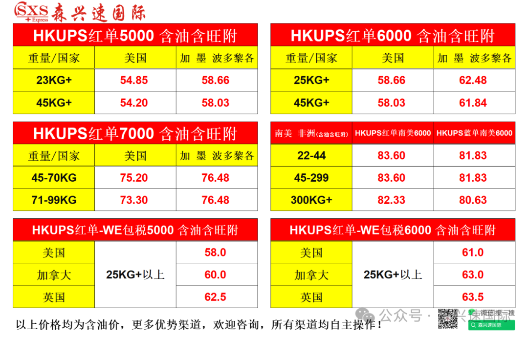 HKUPS红单WE包税5000:美国=58/KG,加拿大=60/KG,英国=62.5/KG