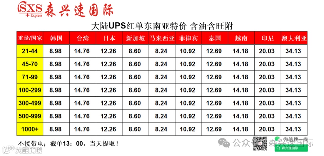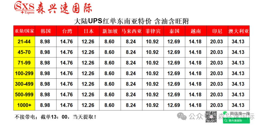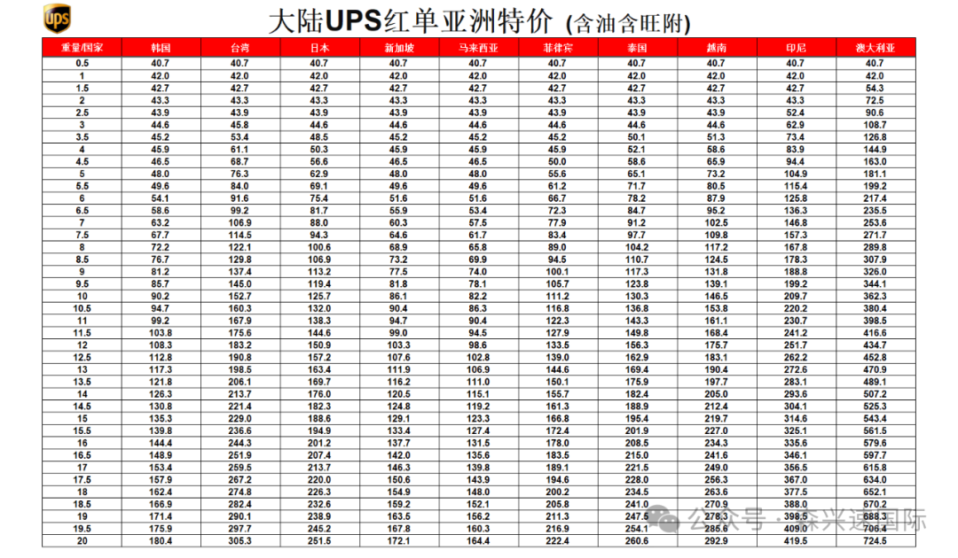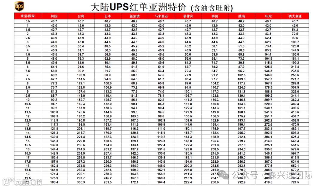 大陆UPS红单亚洲特价:马来西亚8.24/KG,新加坡8.6/KG,韩国8.98/KG;0.5KG小货价格低至40.7,5.5KG低至49.6;