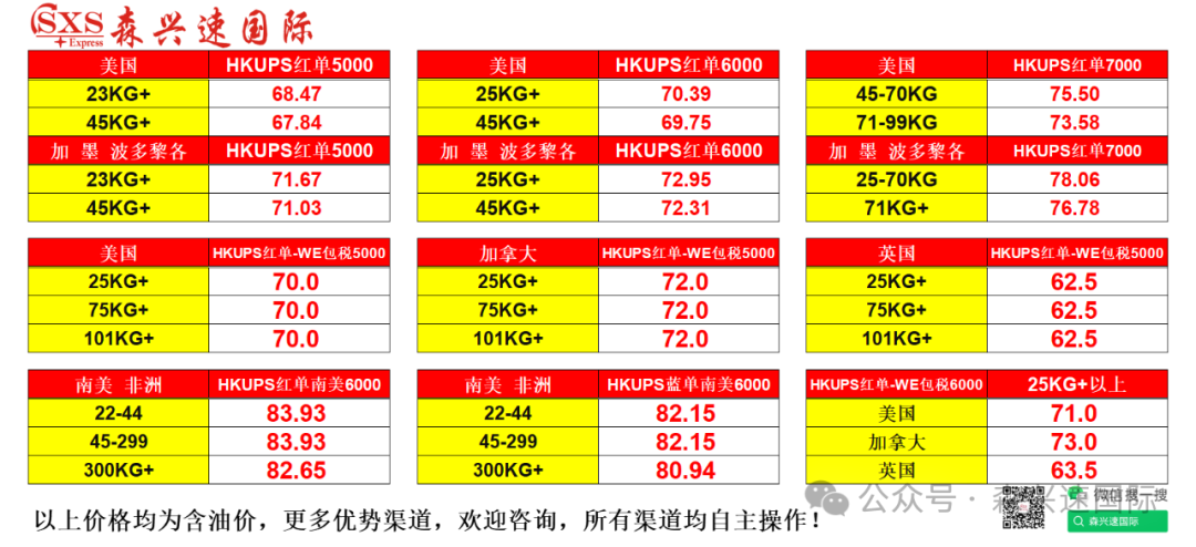 HKUPS红单WE包税5000:美国70/KG,加拿在72/KG,英国62.5/KG