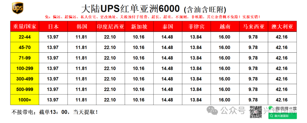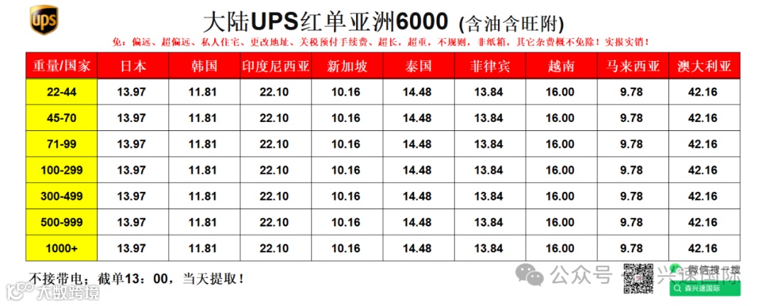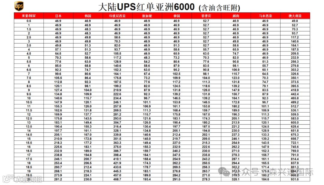 大陆UPS红单亚洲6000:马来西亚9.78/KG,新加坡10.16/KG,韩国11.81/KG;0.5KG小货价格低至46.9,5.5KG低至51.3;