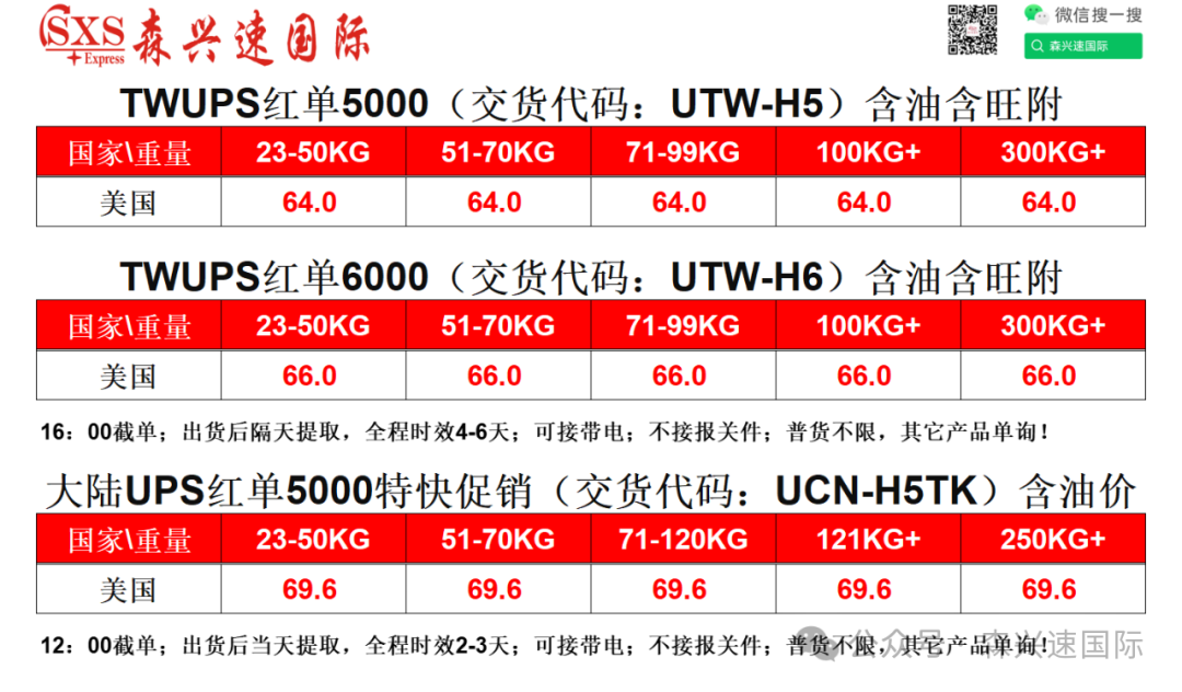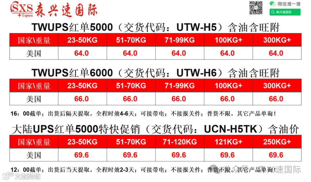 大陆UPS红单5000特快促销,69.6/KG,当天提取,2-3天到达!