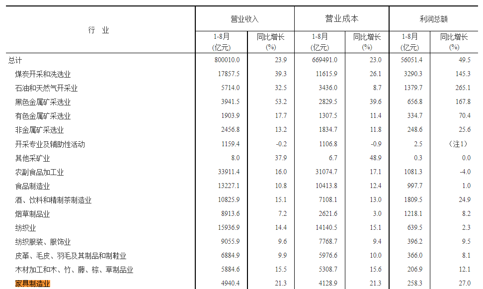 家具行业方面数据而言,1-8月,家具制造业营业收入为4940.4亿元,同比增长21.3%;营业成本为4128.9亿元,同比增长21.3%;利润总额为258.3亿元,同比增长27%。
