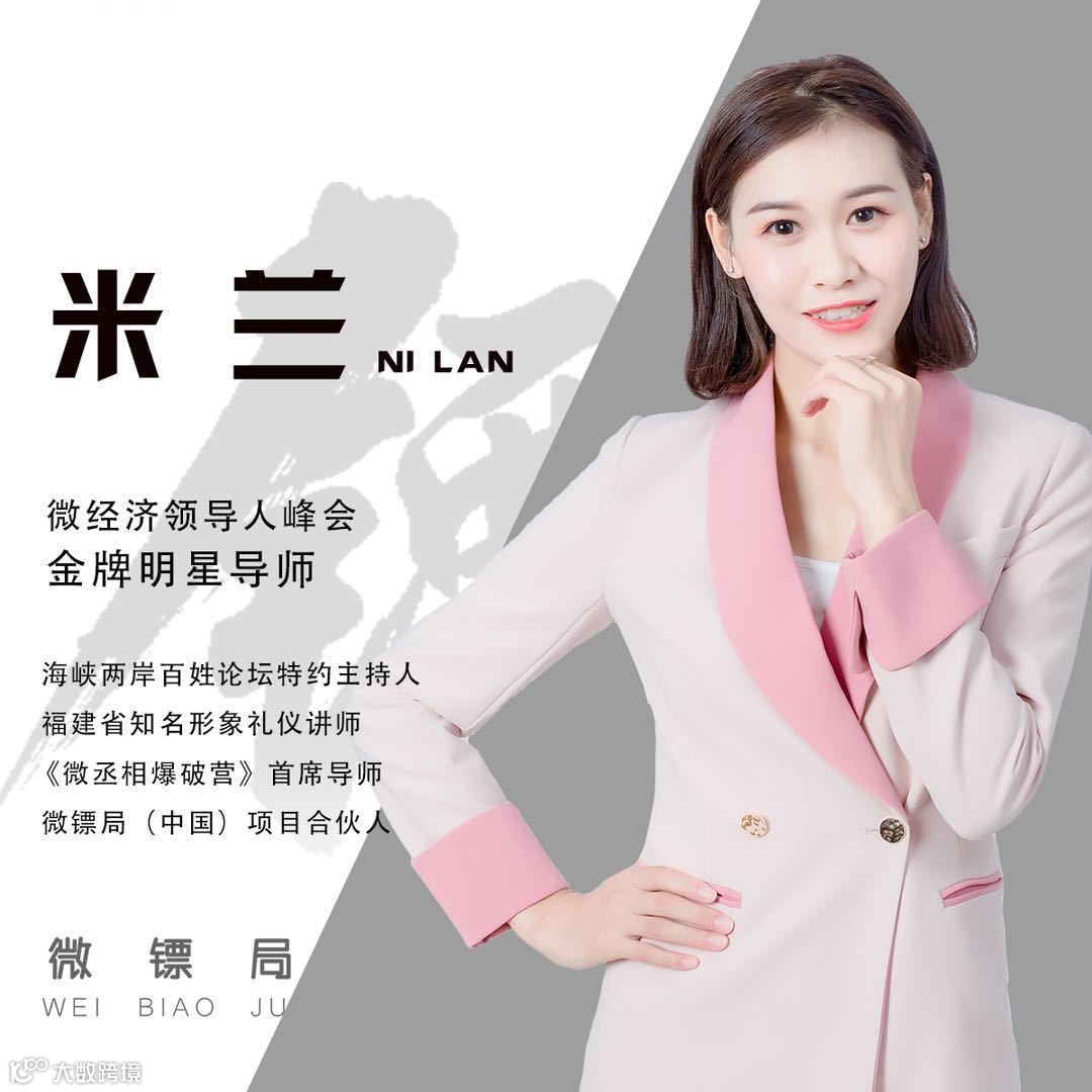 米兰老师,微经济领导人峰会金牌明星导师,海峡两岸百姓论坛特约主持人,福建省知名形象礼仪讲师,《微丞相爆破营》首席导师,微镖局(中国)项目合伙人。