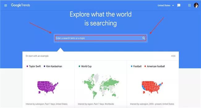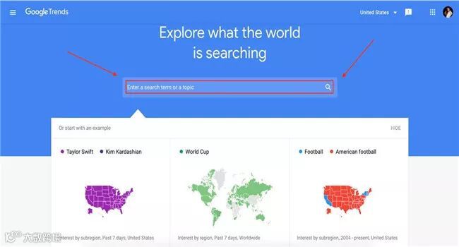 谷歌趋势通过分析谷歌搜索引擎每天数十亿的搜索数据,告诉用户某一关键词或者话题各个时期下在谷歌搜索引擎中展示的频率及其相关统计数据。
