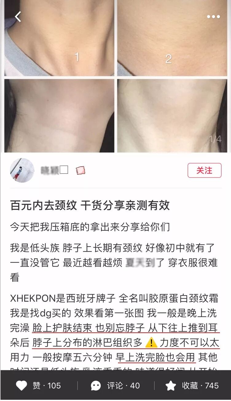 颈纹有两种,一种是胖出了纹路,或者长期低头产生的纹路,这就是所谓的假性颈纹,这款颈纹霜对于这种的效果比较强。