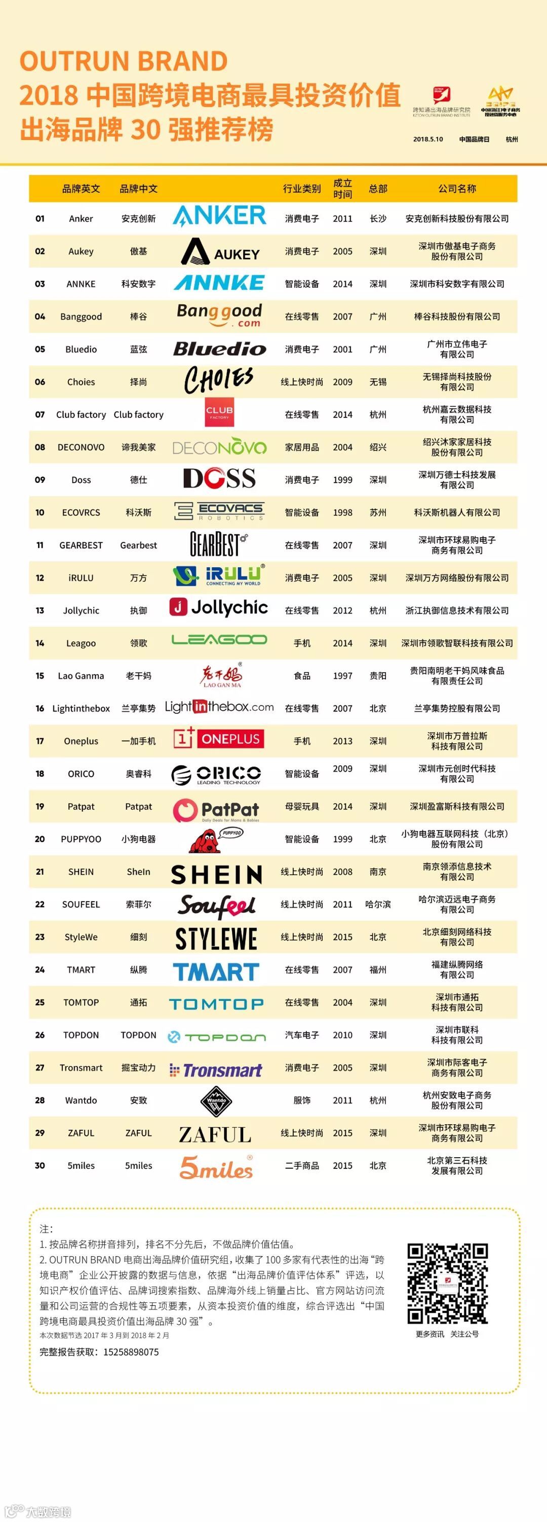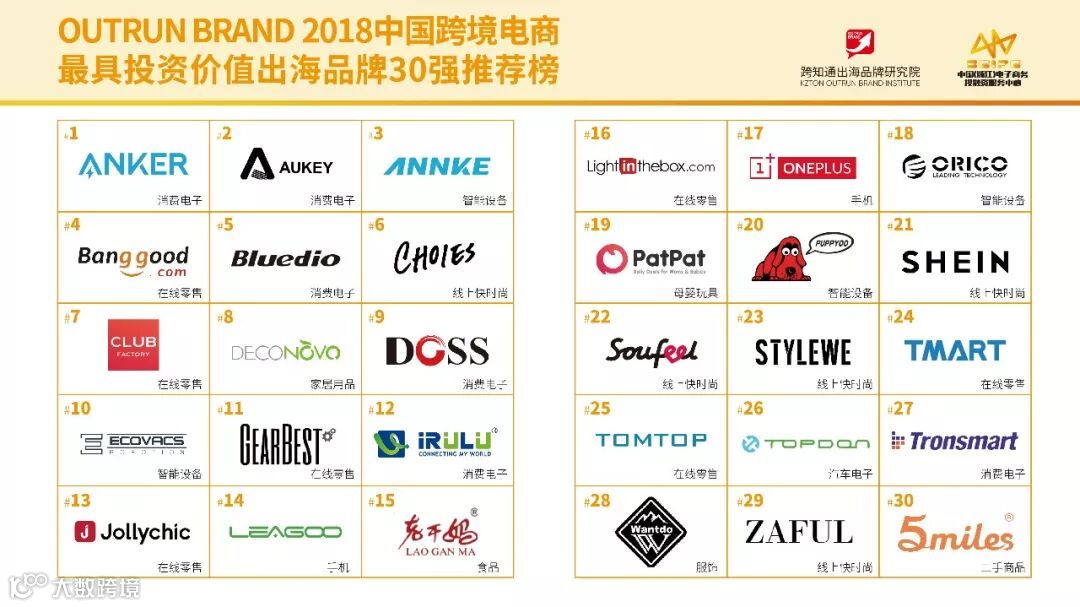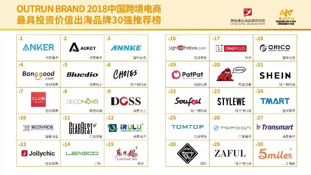 说到品牌排行榜,这是一个很冒险的事,只要有一个榜单出来,不管是哪家机构做的榜单,一定会有人质疑,凭什么是他们,你的依据在哪里?所以为了引起不必要的争论,这次榜单我们不做价值排名,并且我们是从投资人的角度来看品牌的价值,所以我们榜单的名称是“OUTRUN BRAND 2018中国跨境电商最具投资价值出海品牌30 强推荐榜”,是否真的最具有价值,市场来决定,未来告诉你答案。