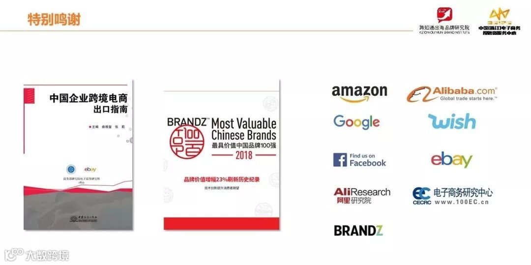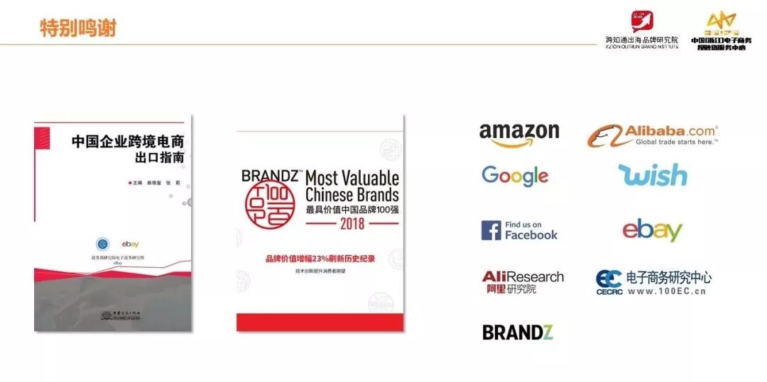 最后,感谢下面这些机构,很多数据来自这个平台发布的报告和公布的数据,这里尤其感谢商务部研究院电子商务研究所张莉所长和eBay王晓忠老师所写的《中国企业跨境电商出口指南》,其中一些观点,我们直接引用了书中的论点,大家可以看看,对企业出口有非常大的帮助。另外,我们报告的设计和榜单的形式,参考了BRANDZ所做的一系列价值报告的形式,他们的设计非常精美,我们借鉴了他们的排版。所以你会看到一份128页,6万多字,图文并茂的分析报告。我们希望给中国的出口跨境电商行业带来新的思考和行业的经验总结。