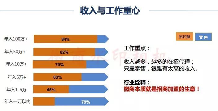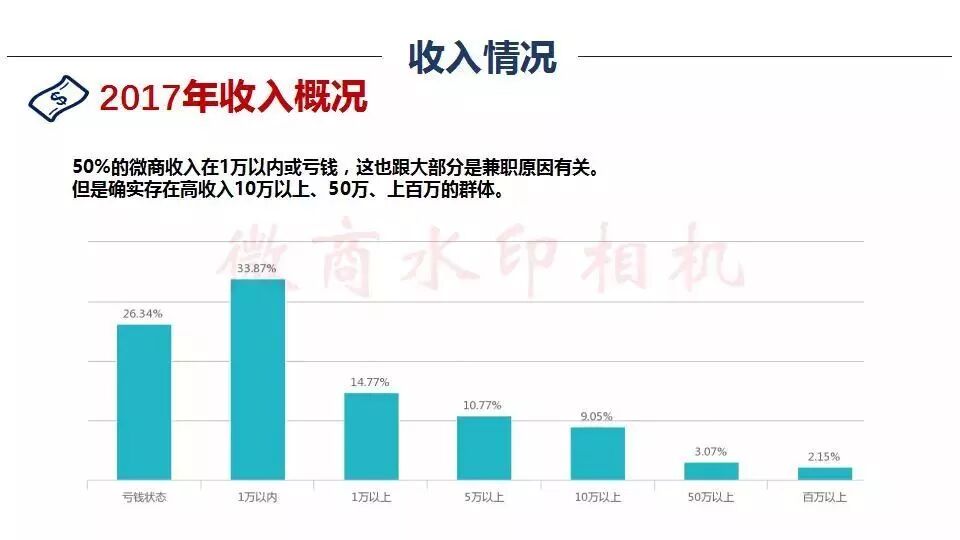 微商大部分年收入都在1万以内,主要原因是这部分群体是兼职,赚点零花钱。一旦全职,收入还是比较可观的。微商里年收入几十万、百万的不在少数。而调研样本里,收入高的微商可能根本没有参与,所以高收入微商比例实际更多。