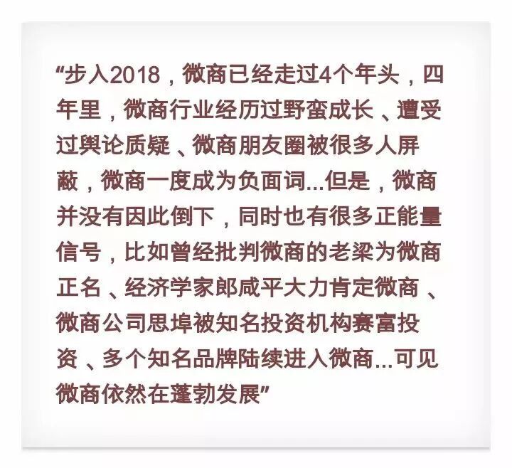 大部分微商都是只做1个品牌,并不是什么都卖,这样给人感觉更专业,也更专注,可以创造大量的反馈素材发圈。其实本质还是因为微商是一个招商加盟的生意,需要交钱拿货,这样更适合做单一品牌。