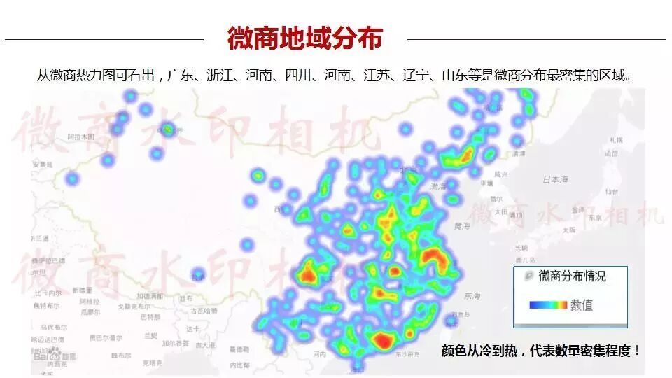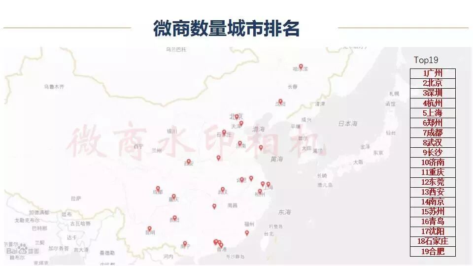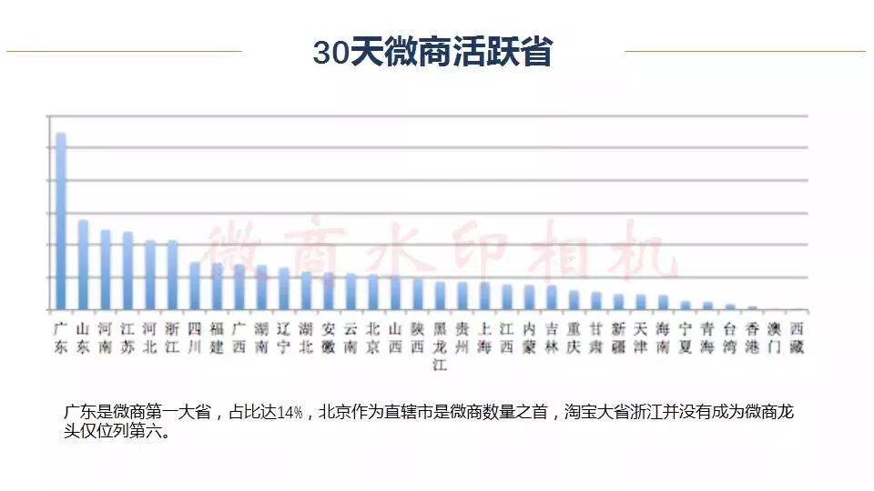 微商分布最大的并不是来自之前的浙江“淘宝村”,而是广东。也不是大家说的微商都分布在三四线城市,我们发现,分布靠前的与人口密度正相关,北上广深排名都很靠前,人口大省河南的省会郑州位居第六,重庆成都这样的相对安逸的城市,微商也非常多!可以说,微商已经无处不在。