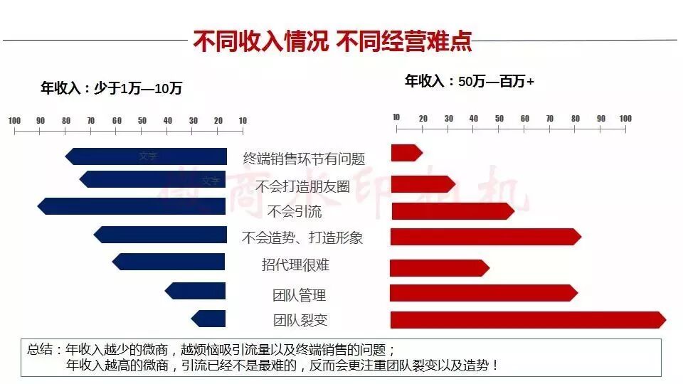 从微商痛点来看,引流是各种规模微商的公共痛点。收入少的微商更多注重实操层面的痛点,如终端销售技能、朋友圈打造、引流等。收入多的团队长的痛点主要是团队裂变和团队管理。